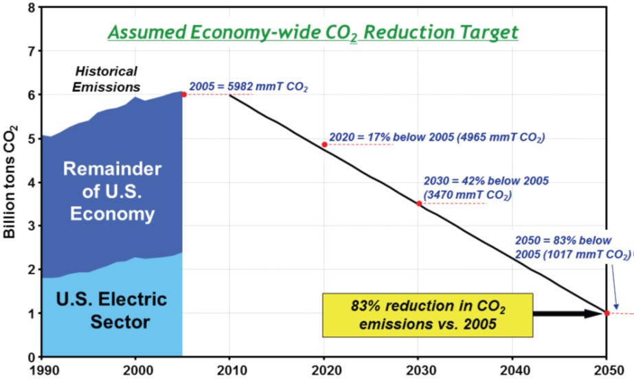 Fig.5 shows the illustration of the CO2 reduction target of the United States for the year 2050.It shows that the US electric sector produces approximately one third of the total emission, reaching 2 billion tons. The total emission target in the coming decades shows a steady decline, and 83% reduction in the CO2 emission must be achieved compared to the emission in 2005. The ambitious plan of emission reduction is one of the major driving forces for developing the renewable energy sources, such as wind energy and solar energy, and the smart grid technologies become the most important issues for the electric industries.