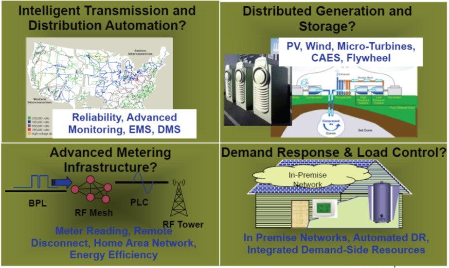 The intelligent transmission and distribution automation is the fundamental requirement of smart grid, which also includes reliability analysis, advanced monitoring facilities, energy management systems (EMSs) and demand side management systems (DMSs). The distributed generation and storage include the wind generation, solar generation, and micro-turbine and flywheel applications. The advanced metering system focuses on the communication networks, such as meter reading, remote sensing and control, home area network (HAN) and energy efficiency management. The demand response and load control focus on customer interaction with the smart grid.