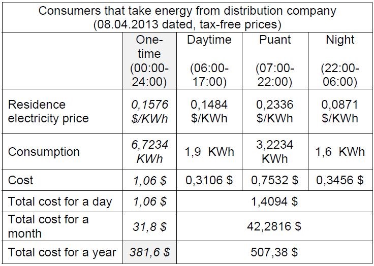 Table 3, for April of 2013, illustrating one-time and multi-time tariffs of public company TEDAŞ that is the biggest distribution company of our country, is in below. In table 2 also costs which occur on the basis of daily, monthly and annual as a result of being priced of the same consumption by one time and multi time tariff.