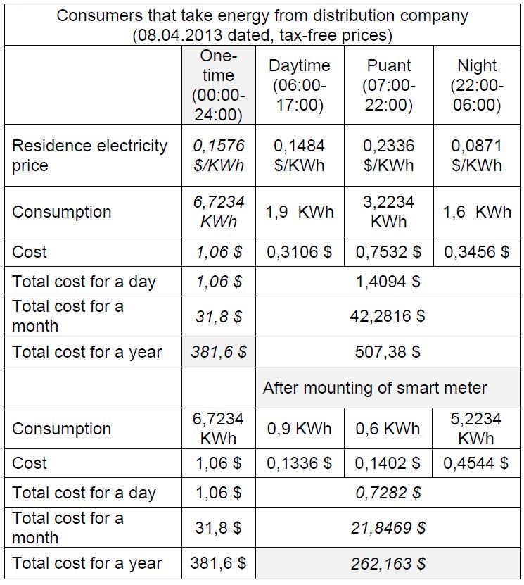 To see and demonstrate advantages of smart meters in consideration of these load consumptions, a comparison based upon one time and multi-time tariffs has been made. It is seen that using multi-time tariff over this system and consumption increases the cost to be paid. Due to client is at his home around 17:00 o’clock and maintains all the main activities until 24:00. A large part of hours when consumption is around the top level corresponds to the interval that energy price is the highest. Therefore, this client consumes the electricity in peak time, in other words, in the most expensive moments. To prevent this situation, smart meters can be used.