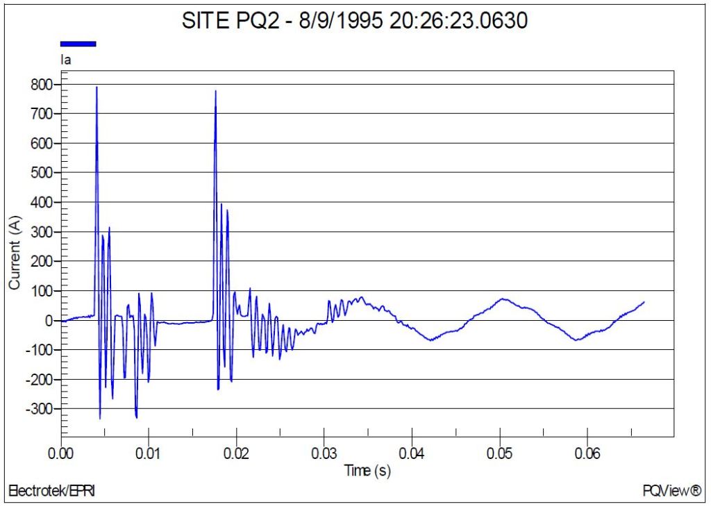 Figure 11 shows the measured current (A) waveform during a capacitor switch failure on feeder #1. The measurement site was PQ2. The maximum transient current magnitude for the event was approximately 790 A. Many similar transient waveforms were recorded at the monitoring site during a one-week period. These events showed that the switch performance had continue to deteriorate.