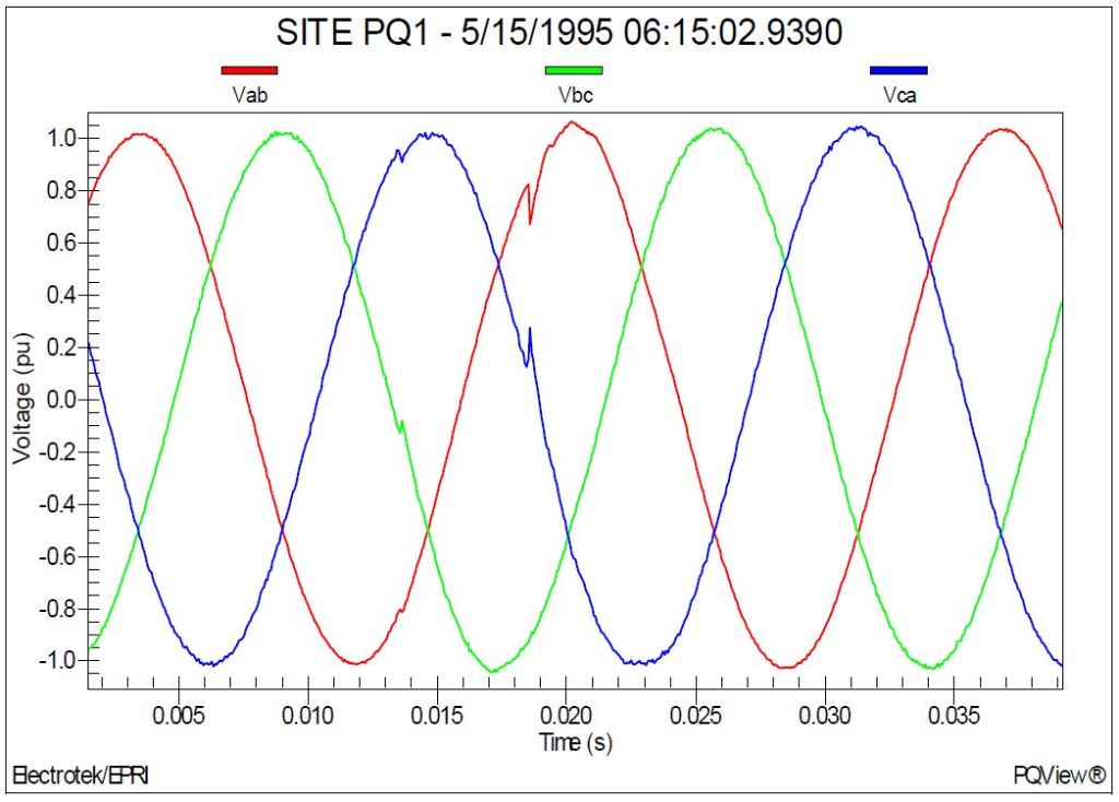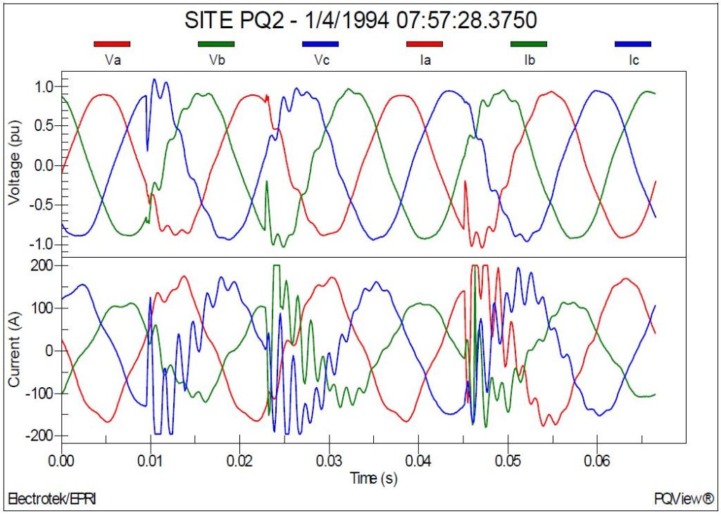Figure 5 shows the measured voltage (per-unit) waveforms during energization of the substation 6,000 kVAr capacitor bank on feeder #1. The capacitor bank was switched using synchronous closing control. The measurement site was PQ1. The magnitude of the transient voltage at the substation bus was 1.06 per-unit.