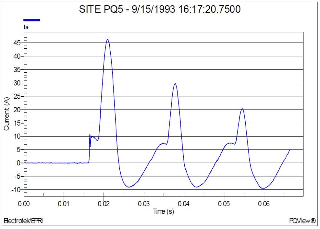 Figure 7 shows the measured current (A) waveform during a transformer energizing event on feeder #4. The measurement site was PQ5. The peak magnitude of the primary inrush current at the monitoring location was 46 A and the duration of the event was approximately 10 cycles. The cause of the transformer inrush was a recloser operation during circuit restoration.