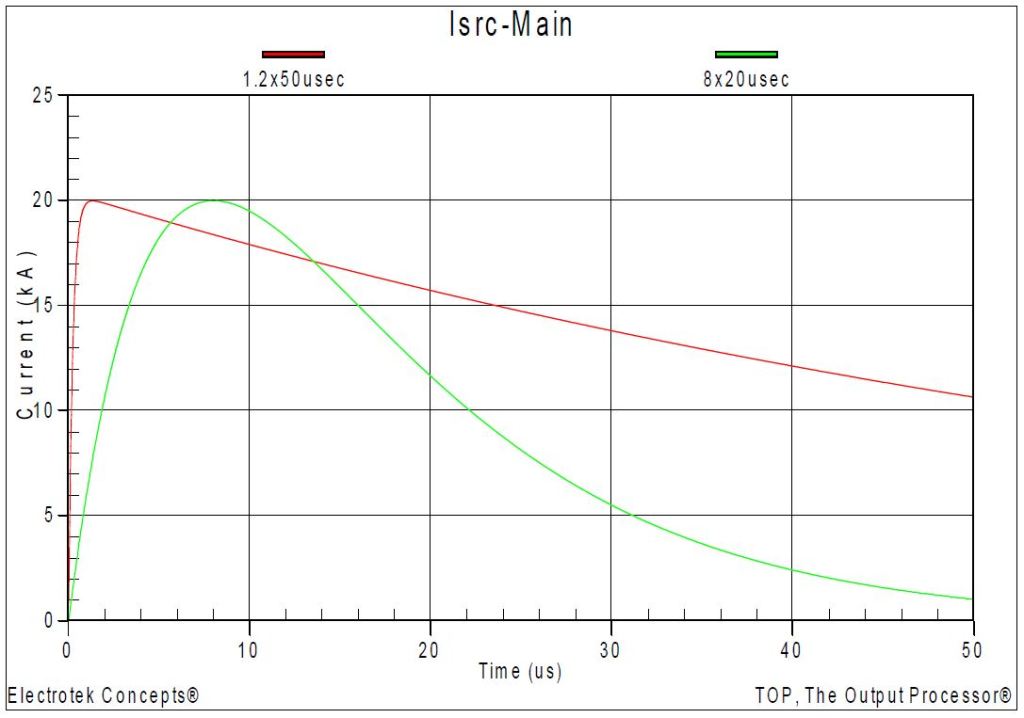 Figure 2 shows two representative lightning current waveforms commonly used in transient simulation studies. The figure shows a 20 kA—1.2×50 μsec and a 20 kA—8×20 μsec lightning stoke current characteristic. The simulation was completed using the PSCAD program.