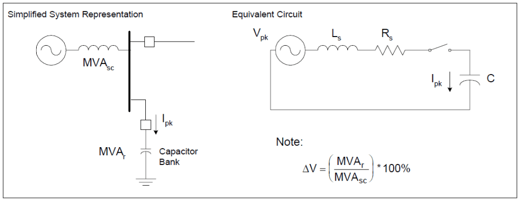 Energizing a shunt capacitor bank from a predominantly inductive source results in an oscillatory transient that can approach twice the normal system peak voltage (Vpk). Figure 1 illustrates the simplified equivalent system for the energizing transient. The characteristic frequency (fs) of this transient is given by: