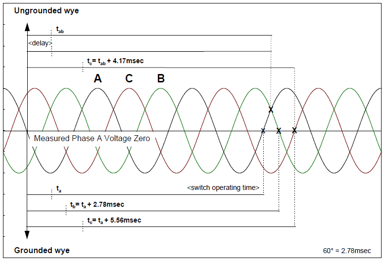 Grounded capacitor banks are controlled by closing the three phases at three successive phase-to-ground voltage zeros (60° separation). Ungrounded banks are controlled by closing the first two phases at a phase-to-phase voltage zero and then delaying the third phase 90 degrees (phase-to-ground zero).