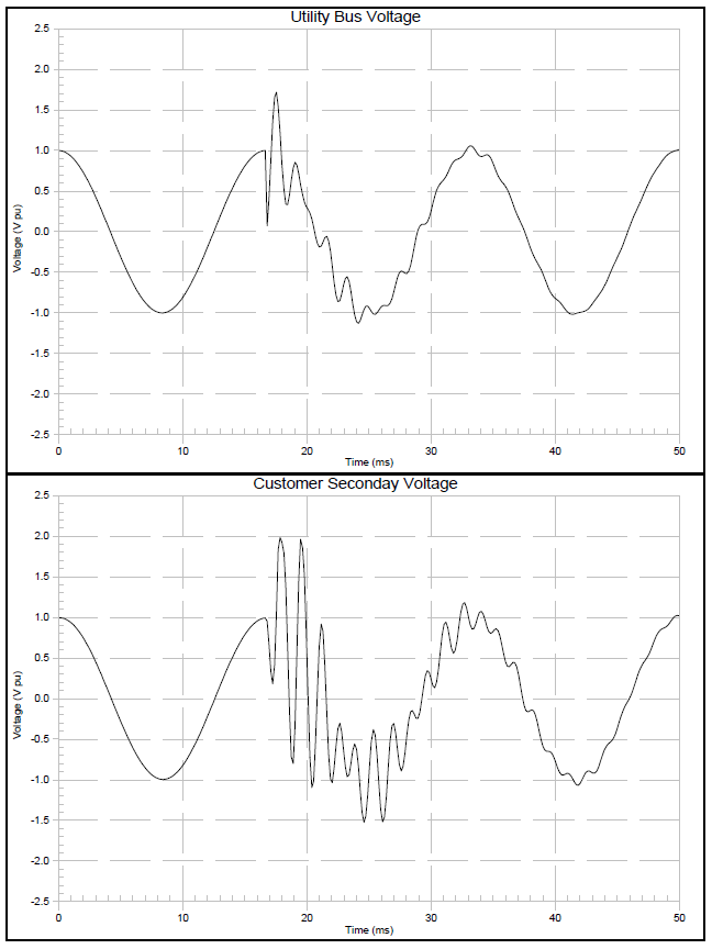 Voltage magnification occurs when a transient oscillation, initiated by the energization of a utility (transmission or distribution) capacitor bank, excites a series resonance formed by a lower voltage system. The result is a higher overvoltage at the lower voltage bus. Previous analysis has indicated that the worst magnified transient occurs when the following conditions are met (refer to Figure 5):