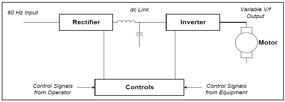 An ASD system consists of three basic components and a control system as previously illustrated in Figure 7. The rectifier converts the three-phase ac input to a dc voltage, and an inverter circuit utilizes the dc signal to produce a variable magnitude, variable frequency ac voltage, that is used to control the speed of an ac motor. A dc motor drive differs from this configuration in that the rectifier is used to control the motor directly.
