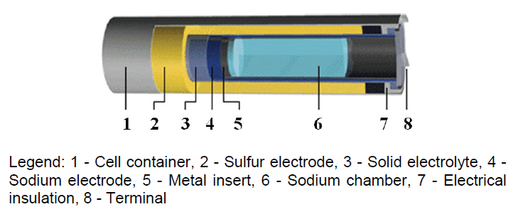 NAS batteries are high capacity battery systems developed for electric power applications. This battery consists of liquid (molten) sulfur at the positive electrode and liquid (molten) sodium at the negative electrode as active materials separated by a solid beta alumina ceramic electrolyte. The electrolyte allows only the positive sodium ions to go through it and combine with the sulfur to form sodium polysulfides (2Na + 4S = Na2S4). [2]