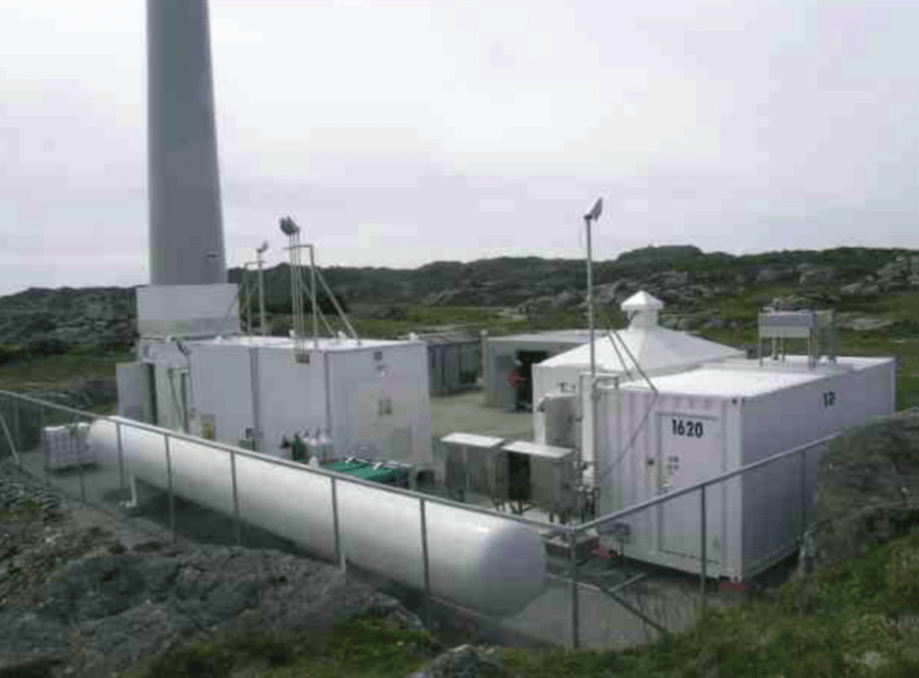 This is a complex combining a wind power plant and the hydrogen storage system based on the Utsira island at the Western coast of Norway. The entire complex is fully autonomous. The insular power distribution network supplies electric power to every household on the island, whose annual consumption amounts to approx. 200 MWh. Figure 11 shows the photograph of the entire complex with the evident tube of wind power plant with the installed capacity of 600kW, with the container and electrolyzer providing the installed capacity of 48kW situated below, with the hydrogen production capacity of 10m3/h, and the compressor with the output of 5,5kW. The photograph shows the container for 2.400 m3 of hydrogen compressed at the ratio of 200 bar. There are containers housing he fuel cell providing the output of 55kW on the right hand side. Both the electrolyzer and the fuel cell are of PEM type. [10]