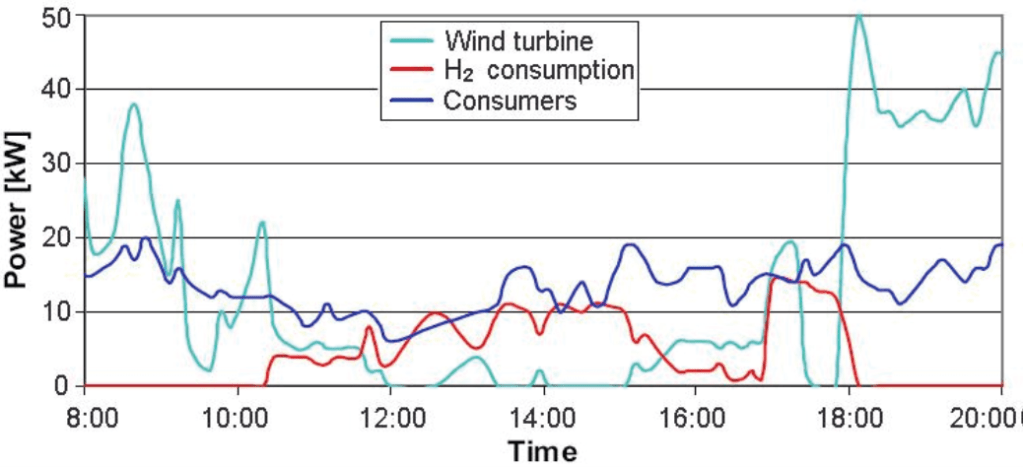 The surplus energy is used to produce hydrogen through water electrolysis. The hydrogen produced is compressed and stored in a gas storage vessel and is available when needed. Under circumstances when the wind turbine is not in operation (i.e. when there is too little or too much wind) the hydrogen is used in a fuel cell and a combustion engine-generator unit to produce power. Example of operation of power plant at Utsira is illustrated on Figure 11. On this graph you can see that the wind power decreases and cannot supply the demand. In this period the fuel cell and engine-generator are started and are balancing the load. [10]