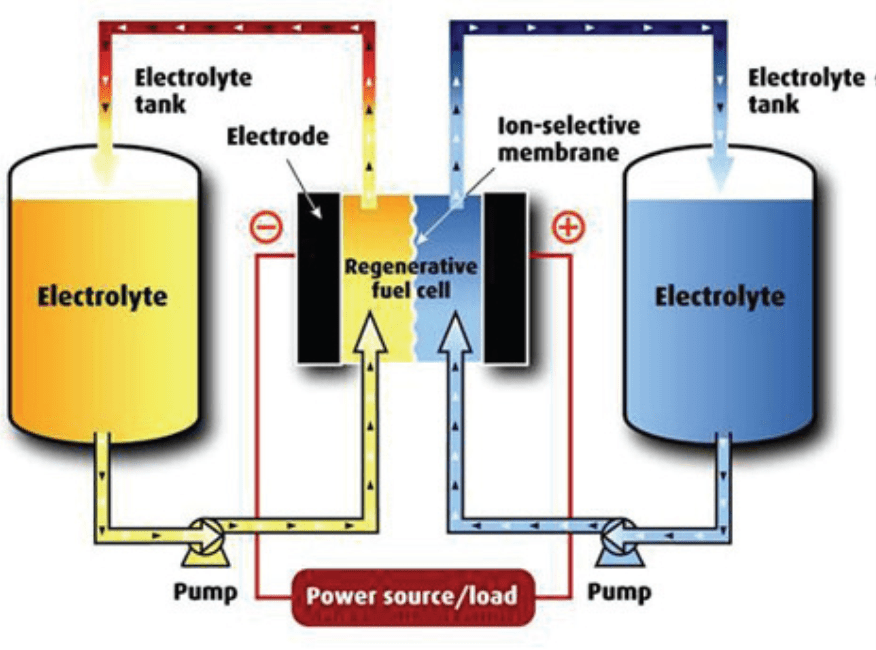 The reduction-oxidation (Redox) flow batteries are considered highly prospective, as these are able to store large amounts of electric power. For this purpose, the ability of some chemical elements (e.g. vanadium) to have more valence states is utilized. The core of this system comprises a reversible reduction-oxidation cell to accommodate the transformation of electrical energy into chemical energy, bound within the electrolyte. These Redox batteries allow for continuous exchange of electrolyte. This ensures their continuous operation until the electrolyte supply has been used up. Electrolytes circulate within two circuits separated by the ion exchanger membrane inside the very cell. The cell interior provides for oxidizing of one form of the electrolyte upon electrochemical process, with the other one being subject to reduction due to the electric current fed or drained into the external electric circuit with the use of electrodes (see Figure 2).
