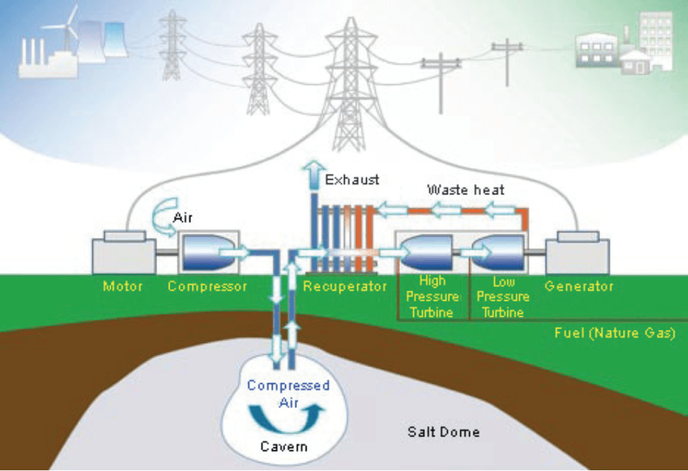 This is a compressed air accumulator linked with a turbine to supply power during take-off peaks within the network as needed. It is a peaking gas turbine power plant that consumes less than 40% of the gas used in conventional gas turbine to produce the same amount of electric output power. This is because, unlike conventional gas turbines that consume about 2/3 of their input fuel to compress air at the time of generation, CAES pre-compresses air using the low cost electricity from the electrical power system at off-peak times and utilizes that energy later along with some gas fuel to generate electricity as needed. The compressed air is often stored in appropriate underground mines or caverns created inside salt rock (see Figure 3). The CAES technology is still used very rarely in global commercial projects. [6]