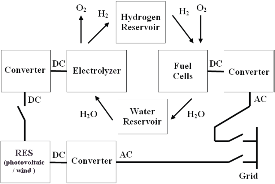 The stage of testing of specific parts of the storage system built will be followed by their linkage to form a working system. The main components of this system comprise the renewable energy source based on the photovoltaic technology, the hydrogen production block with electrolyzer and the container for storage of hydrogen produced and the production electro-block with fuel cell modules and semi-conductor invertors, current inverters respectively.