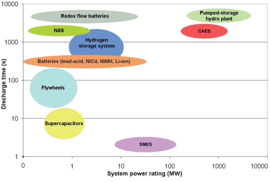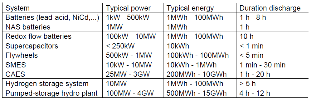 The storage systems described above have been grouped within the Table 1 to allow for proper comparison of basic parameters. Figure 5 then shows a graphic comparison of these systems, in order corresponding to their power rating and the discharge time.