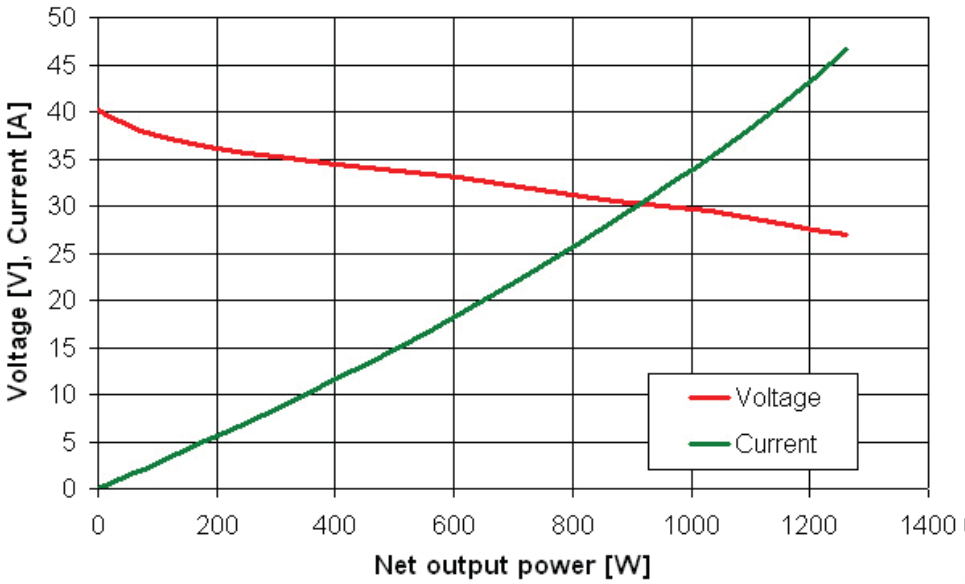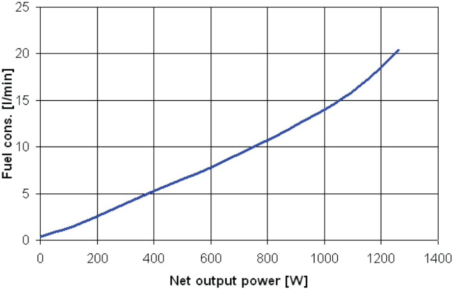 Our research laboratory is equipped with two low-temperature fuel cells Nexa Power Module (Ballard Power Systems Inc.). Rated power output of one Nexa Module is 1200 W. They are being tested in various operating conditions. The measuring procedure consists of cyclic measurements of the load characteristics of NEXA, whereas the system is connected to the distribution network via inverter, in between these measurements, to supply the electric energy. The load characteristics you can see on Figure 7. That is demonstrated in the fuel consumption graph (see Figure 8). This fuel consumption has been determined from the flow meter after the so called purge of cells. This purge deprives cells of impurities and water on regular basis, as those are accumulated on electrode surfaces to intercept the electrochemical reaction.