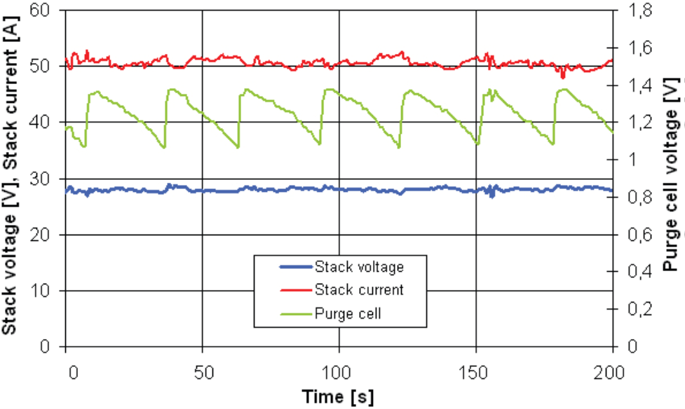 The frequency of purges rises with the increase of cell power output. The NEXA power system measures the voltage over two cells within a stack (fuel cells connected in series), the so called purge cells, to conduct the purging of fuel cells with hydrogen once the voltage has dropped below a certain level to restore the higher voltage in cells again (see Figure 9).