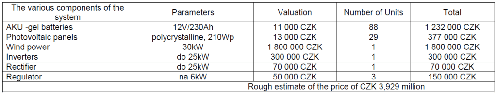 This system is used for illustrating the price costs of this kind of prototype and has function to explore whether is preferable to use a cable connection from the remote grid or need to build such a local island hybrid system. In both cases we expect that public lighting is newly built or will complete its reconstruction. The price of public lighting is not considered. Further there is the calculation and mutual comparation with a variant of remote connection and consumption of electrical energy to power 20 years, a life time of our hybrid system.