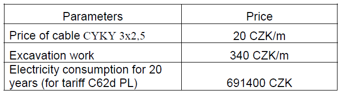 For making an idea there are compared different lengths of power connections with price of a hybrid system. The following table shows that the hybrid system is repayable under the conditions where the length of the power supply cable connections exceed 4 kms. The calculation considers a standard rates of electricity for public lighting for the year 2010, which are fixed during all 20 years.
