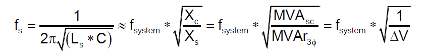 Energizing a shunt capacitor bank from a predominantly inductive source creates an oscillatory transient that can approach twice the normal system peak voltage (Vpk). The characteristic frequency (fs) of this transient is given by the following expression: