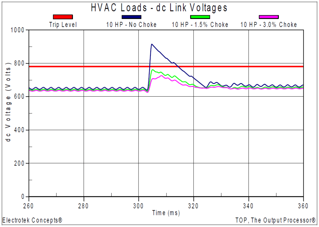 Figure 5 shows the dc link voltages for the two customer HVAC adjustable-speed drives. The maximum dc link voltage was 912 V for the 10 hp drive with no choke and 760 V for the 15 hp drive with a 1.5% choke. The assumed trip level was 780 V. In addition, there were no utility or customer MOV arresters included in the model.