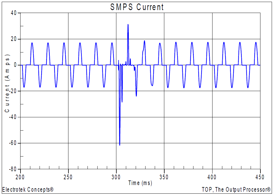 Figure 6 shows the ac current for the worst phase of the customer SMPS loads. The maximum ac current was approximately 62 A during the utility capacitor switching event. Excessive surge currents for secondary power supply loads may cause rectifier diodes, transistors, filter capacitors, MOVs, main fuses, and other components to fail.