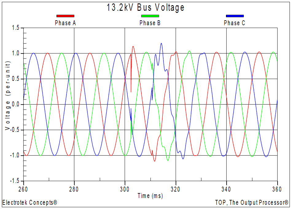 The initial simulation (Case 5a) involved the basecase condition of energizing the 7,200 kVAr, 13.2 kV distribution substation capacitor bank with no mitigation added on either the utility or customer systems. Figure 4 shows the resulting three-phase voltages at the 13.2 kV substation bus. The maximum transient overvoltage was 1.86 per-unit and the simulated steady-state voltage rise was 2.14%, which compares reasonably well with the calculated value of 2.25%.