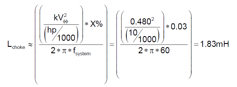 The final two simulations (Case 5c and Case 5d) involved an evaluation of the customer mitigation alternative of two different choke ratings that were added to the 10 hp adjustable-speed drive. The inductance rating for a choke that is specified in %X and hp may be approximated using: