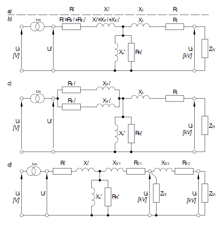 Some of the most common computational schemes of high voltage test transformers are represented in Fig. 5. The values appointed by figure 1 on computational schemes are related to primary side of high voltage test transformer (law voltage), while figure 2 are related to secondary side of high voltage test transformer (high voltage)
