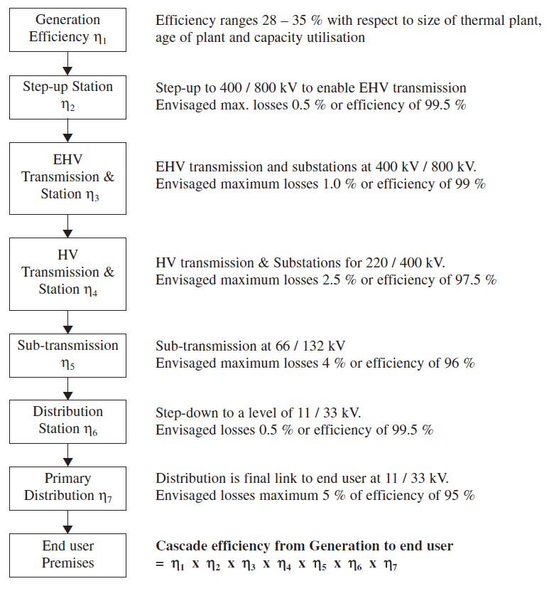 The power source to end user energy efficiency link is a key factor, which influences the energy input at the source of supply. If we consider the electricity flow from generation to the user in terms of cascade energy efficiency, typical cascade efficiency profile from generation to 11 – 33 kV user industry will be as below:
