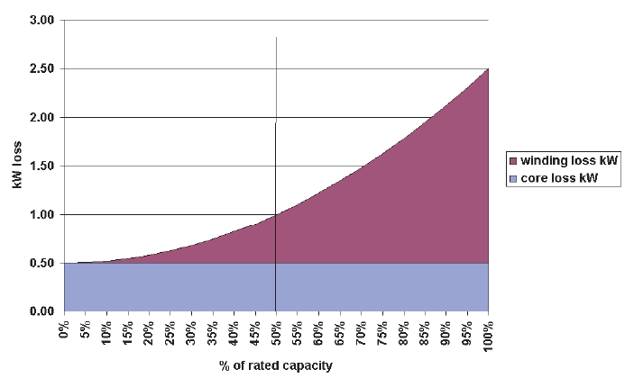 For a given transformer, the manufacturer can supply values for no-load loss, PNO-LOAD, and load loss, PLOAD. The total transformer loss, PTOTAL, at any load level can then be calculated from:
