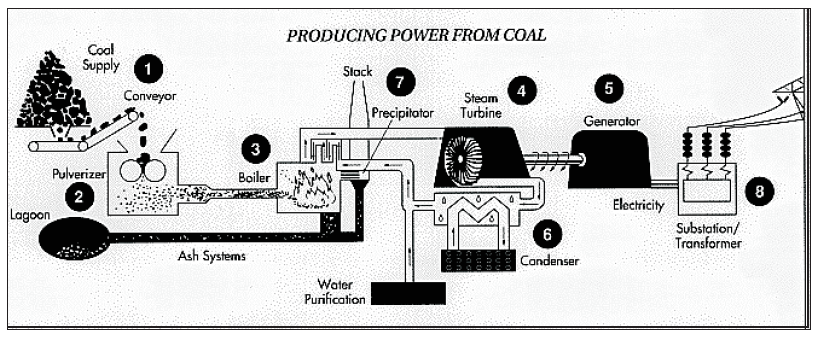 About 70 % of power generating capacity in India is from coal based thermal power plants. The principle of coal-fired power generation plant is shown in Figure 1.2. Energy stored in the coal is converted in to electricity in thermal power plant. Coal is pulverized to the consistency of talcum powder. Then powdered coal is blown into the water wall boiler where it is burned at temperature higher than 1300°C. The heat in the combustion gas is transferred into steam. This high-pressure steam is used to run the steam turbine to spin. Finally turbine rotates the generator to produce electricity.