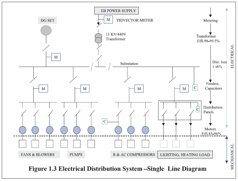 Electrical system: Electricity billing, Electrical load management and maximum demand control, Power factor improvement and its benefit, Selection and location of capacitors, Performance assessment of PF capacitors, Distribution and transformer losses.