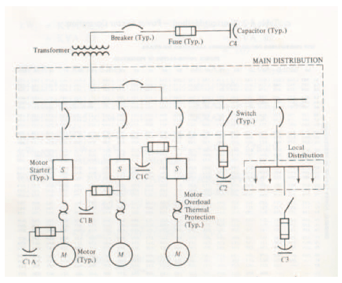 A typical plant single line diagram of electrical distribution system is shown in Figure 1.3