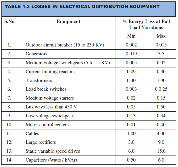 TABLE 1.3 LOSSES IN ELECTRICAL DISTRIBUTION EQUIPMENT
