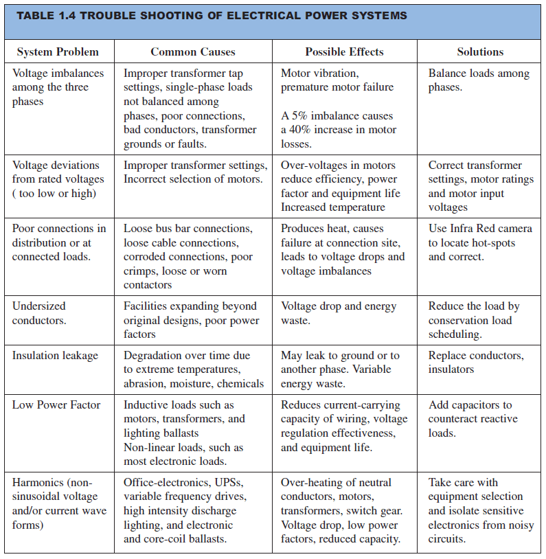 TABLE 1.4 TROUBLE SHOOTING OF ELECTRICAL POWER SYSTEMS