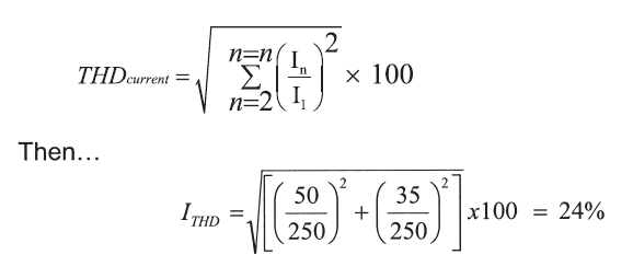 Harmonics can be discussed in terms of current or voltage. A 5th harmonic current is simply a current flowing at 250 Hz on a 50 Hz system. The 5th harmonic current flowing through the system impedance creates a 5th harmonic voltage. Total Harmonic Distortion (THD) expresses the amount of harmonics. The following is the formula for calculating the THD for current: