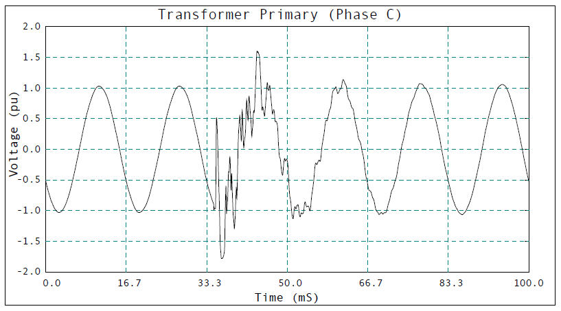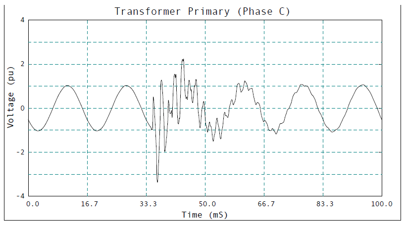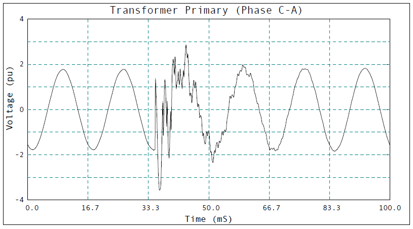 Figure 6 and Figure 7 show the transformer voltages (phase-to-ground and phase-to-phase) with a 90kV MOV in service on the transformer primary (connected phase-to-ground). The maximum phase-to-ground voltage was 1.78 per-unit and the maximum phase-to-phase was 3.57 per-unit