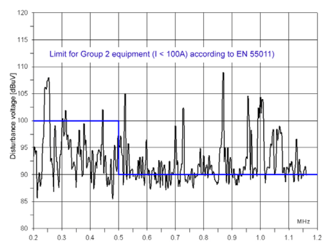 Presented below are some real world measurement results of conducted disturbances measured in real industrial power network. The figures show the electromagnetic disturbances in power networks in relation to current standards. Such relation shows how important it is to provide adequate protection against disturbances of devices in unique environments such as underground mines.