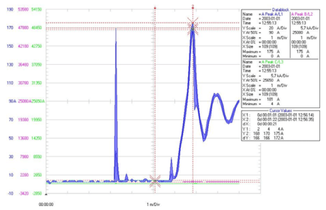 As it was mentioned before, the moments of on/off operations of high power machines in industrial environment can produce big currents in power lines (see figures 5 and 6). Those currents can present some serious interference for other equipment connected to the same power network. The biggest threat can exist for signal lines as well as control and safety equipment.