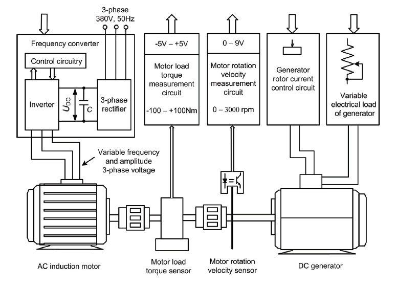 The investigation of the overvoltage in the inverter caused by the AC induction motor deceleration was performed using a special test bench. The block diagram and picture of the test bench are given in Figs.1 and 2. It includes the 4 kW AC induction motor fed from the inverter of the experimental example of the developed frequency converter. The motor drives the 5.5 kW DC generator, which acts as the motor load and is characterized by the relatively high inertness. The test bench includes the motor load torque and rotation velocity sensors and appropriate circuits for conversion of sensor signals to standard signals, which are used for measurement.