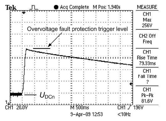 The DC bus voltage transient example for the case when the voltage spike reaches the overvoltage fault protection trigger level is given in Fig. 4. The rising edge steepness of the voltage spike in the analyzed case is about 1.5 V/ms. When the voltage reaches the fault protection trigger level, the transistors of inverter switches are closed by the protection circuit. Since the steepness of voltage spike is relatively low, the DC bus voltage practically is fixed at the value, which corresponds to the overvoltage fault protection trigger level even in the case when overvoltage fault protection circuit with the response time up to several hundreds of microseconds is employed. This fact allows us to use slow overvoltage protection circuit, i.e. circuit, witch has low sensitivity to electromagnetic disturbances produced by the inverter.