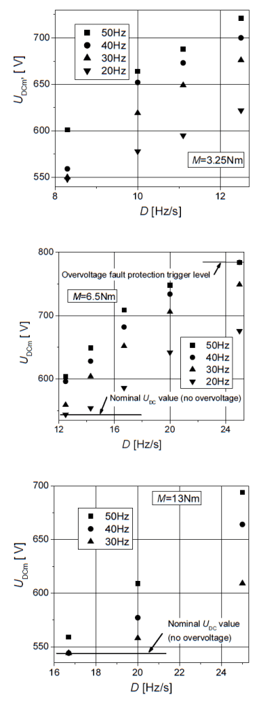 The investigation of the UDC spike duration (Fig. 7) shows that it decreases when the motor initial rotation velocity (initial inverter output voltage frequency) decreases. However, the dependence of the spike duration on the deceleration rate is not monotonic. It has a peak, at which the spike duration reaches the maximal value. The location of the peak depends on the motor load. It is seen (Fig. 7) that in the analyzed case the dependences have the peak at D = 10Hz/s if the motor load is 3.25Nm, and at D = 17Hz/s when the motor load is 6.5Nm.