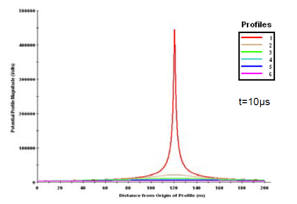 Calculations were made for six different profiles. Distance between them were equal 20 meters. Figure 2 presents arrangement of the observations points. Calculated scalar potential were along X-Y axis on constant depth equal 10cm (average distance from human neck to heart level). Figure 3 and 4 presents scalar potential distribution along for two cases – without and with lightning protection buoy. All presented results were for one selected moment in time – t=10μs. In this specific time scalar potential reaches its maximal value. Without buoy voltage magnitude reaches up to 440kV. With lightning protection buoy voltage rise up to 146kV. It is three times lower scalar potential value with respect to case without it. According to calculation results safe distance for a human being from lightning strike point is about 30 meters (see figure 5). As a safe voltage level 985V were assumed according the IEEE Std 80-2002 (fault clearing time 0,1s and step voltage 985 V) [6,7,8,9].