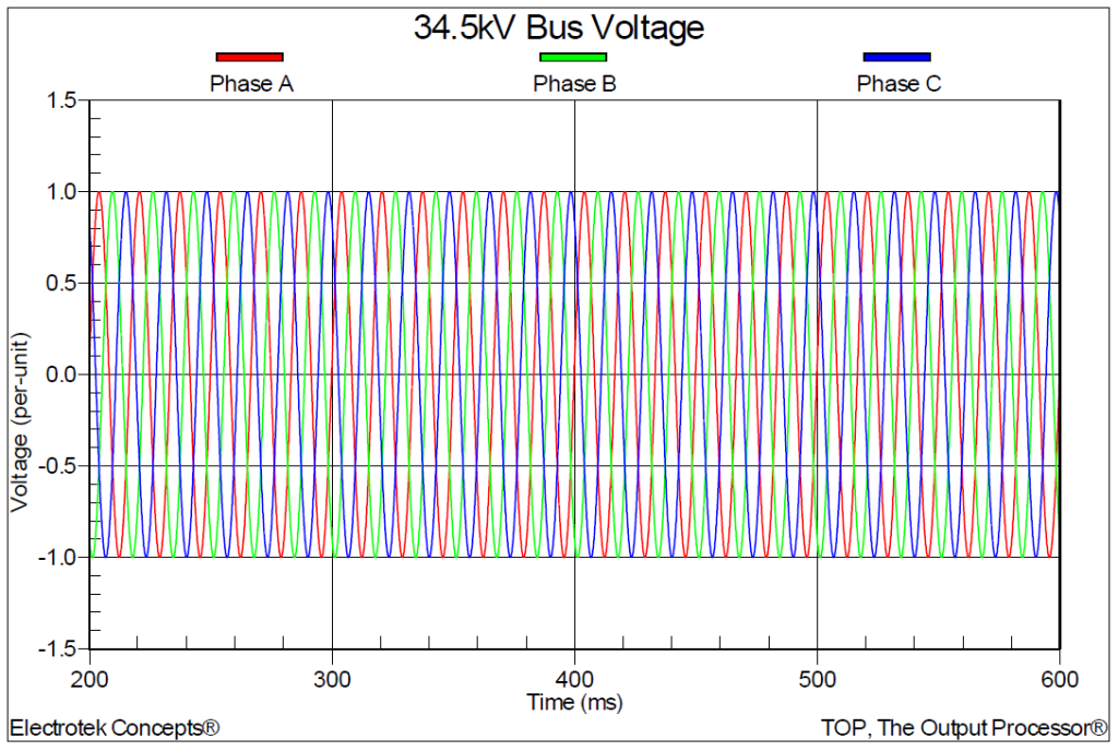 The steady-state 34.5 kV bus voltage (in per-unit) is shown in Figure 2. The simulation results for Case 1 included: