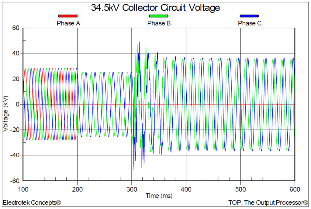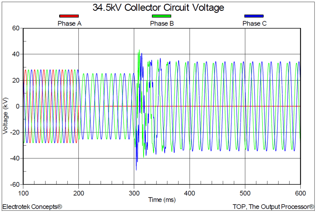 The 34.5 kV collector circuit voltages for Case 2 are shown in Figure 3. The waveform shows the effect of the single-phase-to-ground (Phase A) fault at 0.2 seconds and the circuit breaker opening at 0.3 seconds. After the initial oscillatory transients have dissipated, the peak fundamental frequency temporary overvoltage on the healthy phase (Phase C) is 49.518 kV, which is 1.76 per-unit (49.518 / (34.5*sqrt(2)/sqrt(3)). This value is somewhat higher than the theoretical value of 1.73 per-unit, which is primarily due to the capacitance of the collector circuit.