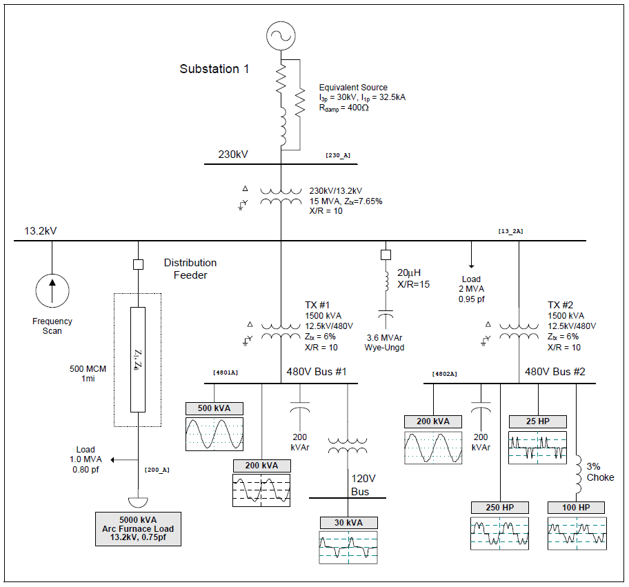 The circuit modeled for the case involved a 230kV/13.2kV utility substation supplying two 1,500 kVA customer step-down transformers and one 5,000 kVA arc furnace load. Each customer has a switchable 200 kVAr, 480-volt capacitor bank and a variety of nonlinear loads.