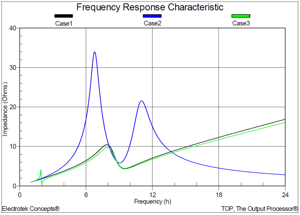 Figure 3 shows the results for the three frequency scan simulations. Case #1 was the base case with no utility capacitor banks included in the model. Case #2 was the case with the 3.6 MVAr on the 13.2kV substation bus in service. Case #3 was the case with the 3.6 MVAr capacitor bank reconfigured as 2nd harmonic filter. The parallel resonances for Case #2 were about 407 Hz (6.8th) and 660 Hz (11th).