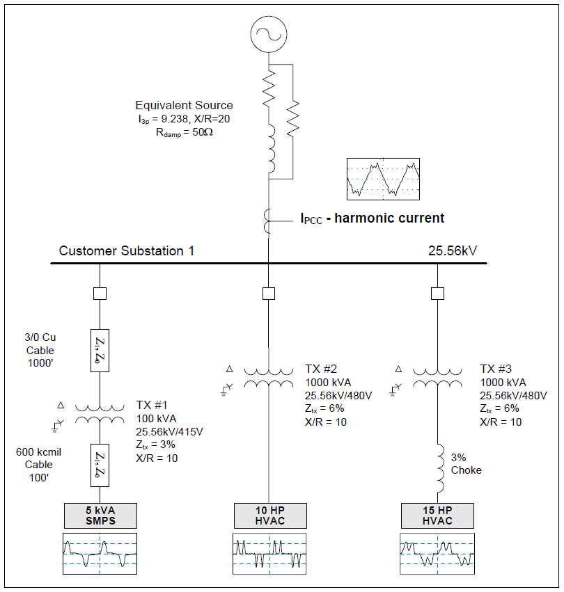 The circuit model for the case involved a 25.56kV customer substation with two 1,000 kVA step-down transformers supplying HVAC loads and one 100 kVA transformer supplying switch-mode power supply (SMPS) loads.