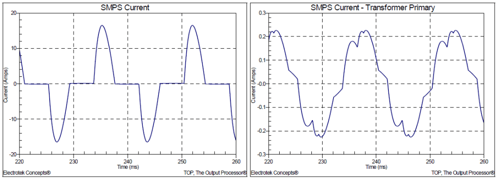 The case study evaluates the effects of transformer connections to determine the harmonic current distortion levels on both the primary and secondary sides of the customer transformers. Figure 2 shows the simulated power supply current and the resulting current on the transformer primary due to the delta/wye connection that traps the zero sequence harmonics in the primary delta winding.
